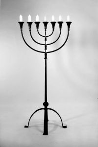 Handgeschmiedete Menora, ca. 1,60 m hoch. Oberfläche geölt oder gewachst.